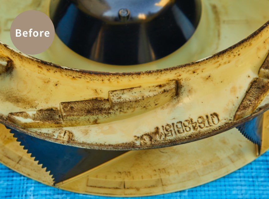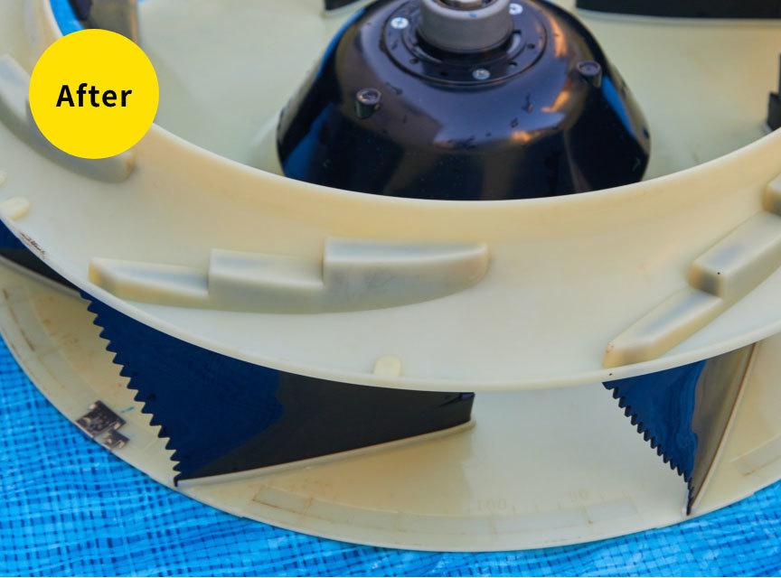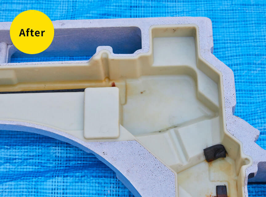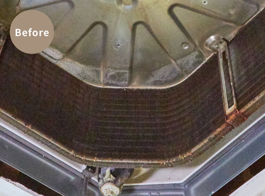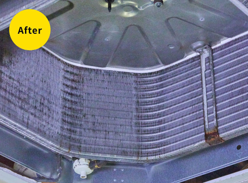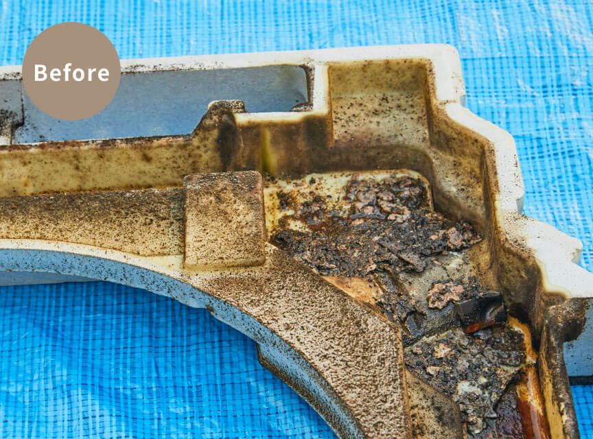 分解可能な部品はすべて取り外し、本体熱交換機は特殊な溶剤(洗剤)により強力に洗浄します。分解した部品も1つ1つ丁寧に洗浄致します。