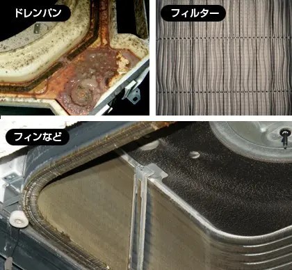 エアコンを分解すると熱交換器はもちろん、各パーツもカビや雑菌・スライムに侵されており非常に不衛生な状態です。このようなエアコン内部を空気が通りお部屋に風を送風しています!カビは様々なアレルギーや病気の原因になると言われており定期的なお掃除が必要になります。またエアコン清掃によりエアコンへの負荷が軽減されエアコンの故障防止や、電気代の節約にもつながります。